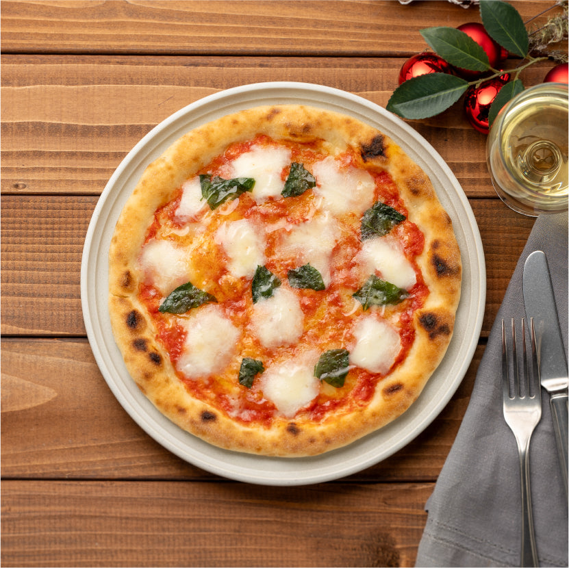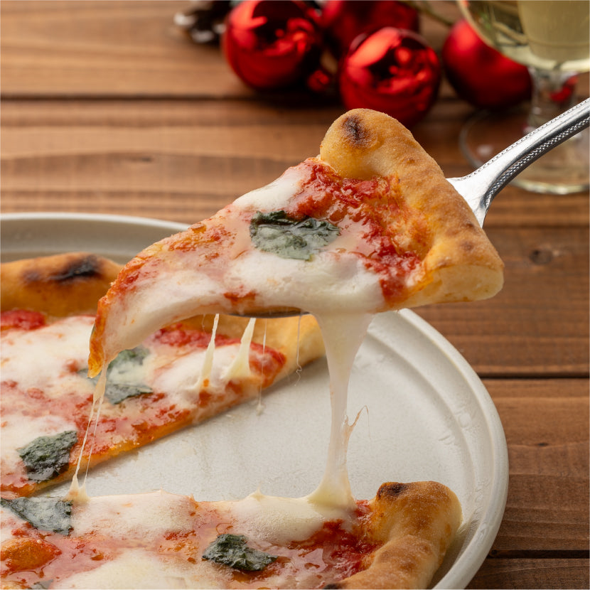 愛知県のSanto Lucio (サントルチオ)さまのもとで作られる厳選された新鮮なモッツァレラチーズを使用した贅沢なマルゲリータ。トマトソースにモッツァレラチーズ、バジルだけというシンプルなピッツァだからこそ、原材料にこだわってお作りします。