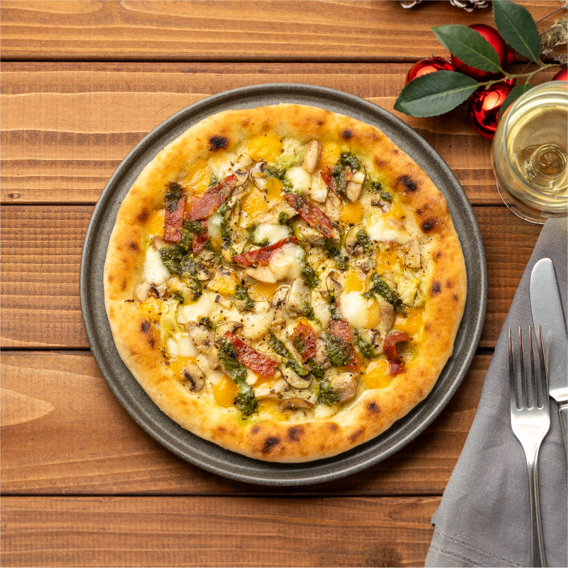 それぞれの食材の風味と食感が楽しい、見た目も豪華な食べ応えのあるピッツァです。